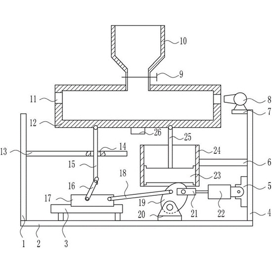 ![]() [0002] 本发明涉及一种农产业用优质稻谷筛选装置,尤其涉及一种农产业用优质稻谷摆动式筛选装置。 [0003] 背景技术 [0004] 稻谷是指没有去除稻壳的子实。是一种50-130厘米高的年生性植物,主茎在底部分叉成数个分蘖,分蘖的末端可长出圆锥状花簇。每个花簇可长出50-500个小穗状花序,每个小穗状花序可给出一个果实,即核质仁。果实收获后不与花簇的植物结构完全分离。是我国最主要的粮食作物之一,我国水稻的播种面积约占粮食作物总面积的1/4,产量约占全国粮食总产量的1/2,在商品粮中占一半以上。产区遍及全国各地。我国是稻作历史最悠久、水稻遗传资源最丰富的国家之一,浙江河姆渡、湖南罗家角、河南贾湖出土的炭化稻谷证实,中国的稻作栽培至少已有7000年以上的历史,是世界栽培稻起源地之一。稻谷收集后需要将空稻壳、劣质稻谷与优质稻谷分离出。 [0005] 现有的农产业用优质稻谷筛选装置存在筛选不彻底、结构单一、费时费力的缺点,因此亟需研发一种筛选彻底、结构新颖、省时省力的农产业用优质稻谷摆动式筛选装置。 [0006] 发明内容 [0007] (1)要解决的技术问题 [0008] 本发明为了克服现有的农产业用优质稻谷筛选装置存在筛选不彻底、结构单一、费时费力的缺点,本发明要解决的技术问题是提供一种筛选彻底、结构新颖、省时省力的农产业用优质稻谷摆动式筛选装置。 [0009] (2)技术方案 [0010] 为了解决上述技术问题,本发明提供了这样一种农产业用优质稻谷摆动式筛选装置,包括有左架、底板、滑轨、右架、固定座、第一支架、固定板、风机、电控阀、进料斗、筛选箱、第二支架、第一升降杆、第二连杆、滑块、第一连杆、凸轮、安装座、固定块、气缸、活塞、缸体和第二升降杆,底板顶部左侧设有左架,左架右侧上部设有第二支架,第二支架右部开有第二通孔,底板顶部左侧设有滑轨,滑轨上滑动式连接有滑块,滑块前侧右部铰接连接有第一连杆,滑块前侧左部铰接连接有第二连杆,第二连杆顶端铰接连接有第一升降杆,底板顶部右侧设有安装座和右架,安装座位于右架左侧,安装座上安装有凸轮第一连杆右端与凸轮前侧左部铰接连接,右架左侧从上至下依次设有固定板、第一支架和固定座,固定板顶部设有风机,第一支架左端设有缸体,缸体内设有活塞并与缸体配合,活塞顶部设有第二升降杆,第一升降杆和第二升降杆顶端铰接连接有筛选箱,筛选箱两侧上部对称设有第一通孔,风机出风口正对第一通孔,筛选箱顶部中间设有进料斗,进料斗下部设有电控阀,固定座上设有气缸,气缸的伸缩杆上设有固定块,固定块与凸轮前侧右部铰接连接。 [0011] 优选地,还包括有激振器,筛选箱底部中间设有激振器。 [0012] 优选地,底板材质为不锈钢。 [0013] 工作原理:使用本装置时,工人先打开电控阀,然后将一定量未筛选的稻谷倒入进料斗,稻谷通过进料斗掉入筛选箱内,然后控制电控阀关闭,然后控制风机启动,然后控制气缸伸长,带动凸轮逆时针旋转,凸轮通过第一连杆带动滑块向左运动,进而带动第二连杆向左运动,从而带动第一升降杆下运动,使筛选箱左端向下运动,凸轮逆时针旋转的同时,带动活塞向上运动,进而带动第二升降杆向上运动,使筛选箱右端向上运动,如此使筛选箱向左晃动,当气缸伸长一定长度时,控制气缸收缩,带动凸轮顺时针旋转,凸轮通过第一连杆带动滑块向右运动,进而带动第二连杆向右运动,从而带动第一升降杆向上运动,使筛选箱左端向上运动,凸轮顺时针旋转的同时,带动活塞向下运动,进而带动第二升降杆向下运动,使筛选箱右端向下运动,如此使筛选箱向右晃动,如此反复,使筛选箱不断左右晃动,可以将稻谷里的空稻壳和劣质稻谷翻出至表面,风机通过第一通孔,将表面的空稻壳和劣质稻谷吹出筛选箱外,筛选出优质稻谷。当筛选完成后,控制风机关闭,控制气缸停止伸缩,然后工人对筛选好的优质稻谷进行处理。本装置结构新颖、筛选彻底、可以省时省力,能减小工人的劳动强度,降低劳动成本,有效提工人的工作效率。 [0014] 因为还包括有激振器,筛选箱底部中间设有激振器,筛选稻谷时,控制激振器启动,激振器震动筛选框,使空稻壳和劣质稻谷均匀翻出至表面,使筛选更彻底。 [0015] 因为底板材质为不锈钢,不锈钢耐腐蚀性强和耐酸性强,可以延长本装置的使用寿命。 [0016] (3)有益效果 [0017] 本发明达到了筛选彻底、结构新颖、省时省力的效果,可以大大减小工人的劳动强度,有效降低劳动成本,提高工人的工作效率,能够增强企业的竞争力。 [0018] 附图说明 [0019] 图1为本发明的第一种主视结构示意图。 [0020] 图2为本发明的第二种主视结构示意图。 [0021] 附图中的标记为:1-左架,2-底板,3-滑轨,4-右架,5-固定座,6-第一支架,7-固定板,8-风机,9-电控阀,10-进料斗,11-第一通孔,12-筛选箱,13-第二支架,14-第二通孔,15-第一升降杆,16-第二连杆,17-滑块,18-第一连杆,19-凸轮,20-安装座,21-固定块,22-气缸,23-活塞,24-缸体,25-第二升降杆,26-激振器。 [0022] 具体实施方式 [0023] 下面结合附图和实施例对本发明作进一步的说明。 [0024] 实施例1 [0025] 一种农产业用优质稻谷摆动式筛选装置,如图1-2所示,包括有左架1、底板2、滑轨3、右架4、固定座5、第一支架6、固定板7、风机8、电控阀9、进料斗10、筛选箱12、第二支架13、第一升降杆15、第二连杆16、滑块17、第一连杆18